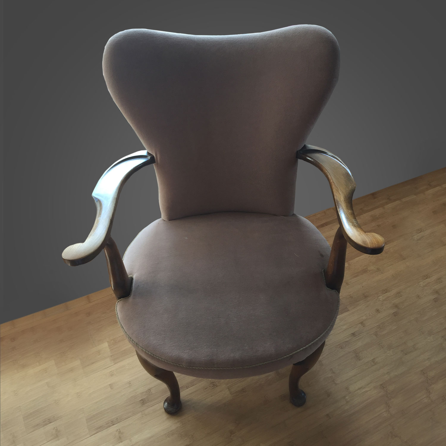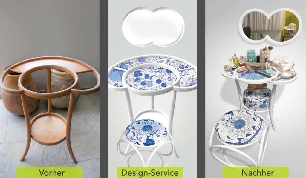 Dieser aus den Weiten des 20. Jhdts. stammende Schminktisch erhielt nach seiner Reise aus Paris von unserer Werkstatt sein neues G’wand – une nouvelle robe gewissermaßen … Der dazu gehörende Thonet-Hocker, wurde restauriert, das Wiener Geflecht entfernt und durch eine Polsterung ersetzt. Tapeziert wurden die beiden mit dem Svenskt Tenn Stoff „La Plata“, der zwischen 1943 und 1945 von Josef Frank entworfen wurde. In den Abbildungen sehen Sie das Original, unseren Entwurf aus dem Design-Service und schließlich die fertiggestellten Stücke. Wir, und vor allem die neue Besitzerin sind überaus glücklich mit dieser stilistischen Verwandlung!