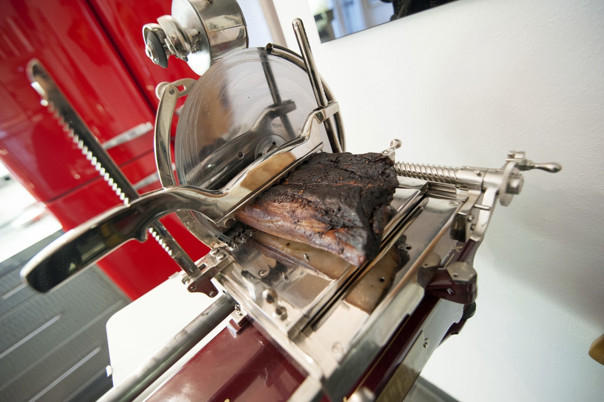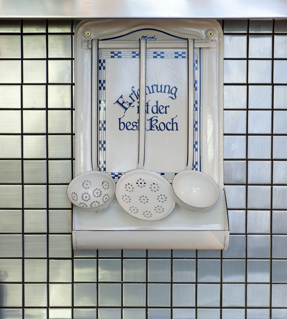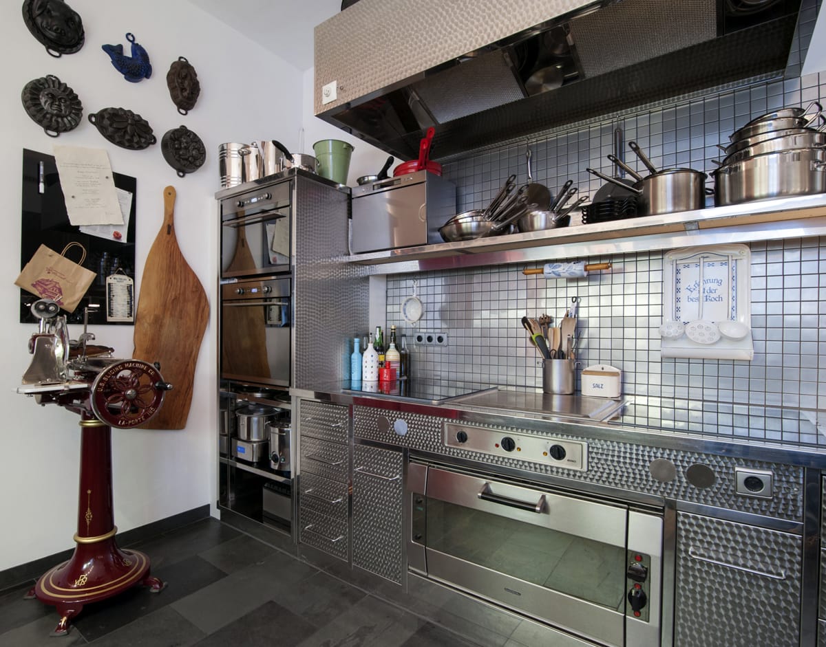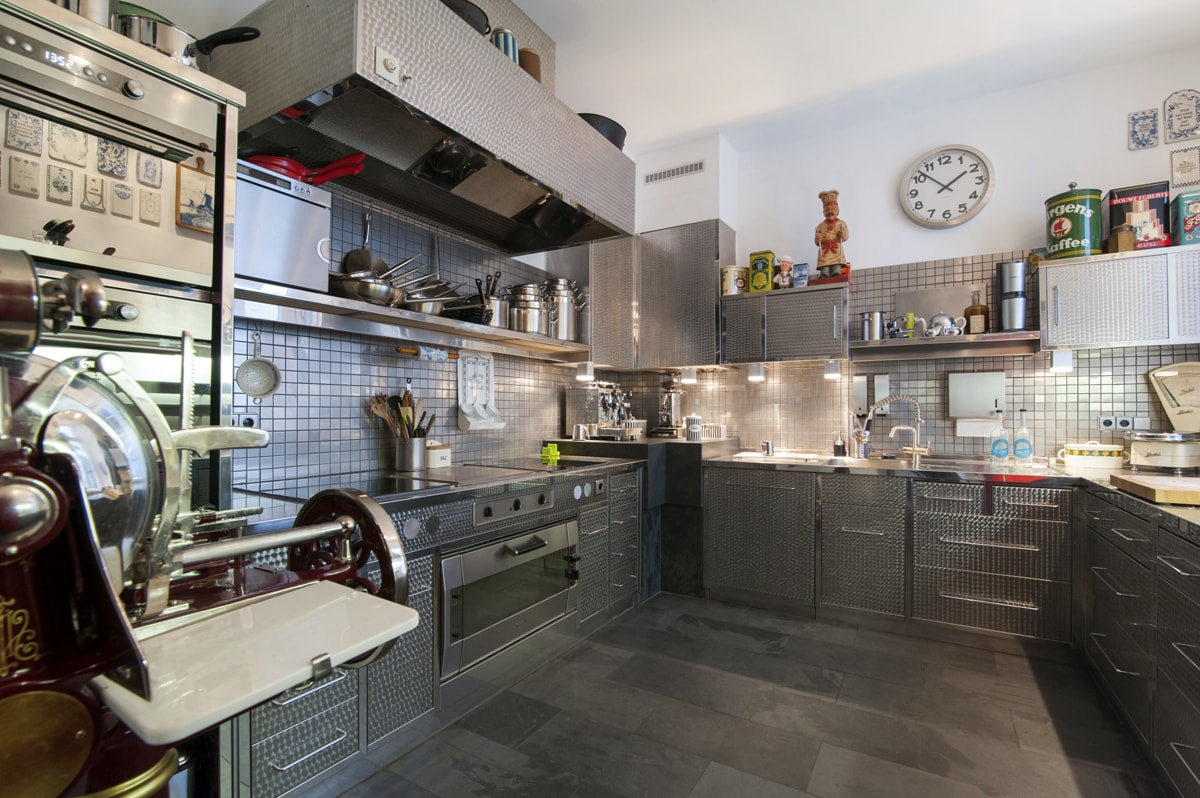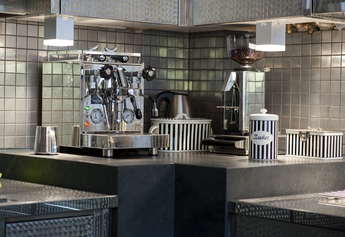 Diese Einzelanfertigung aus Edelstahl wurde bewusst topfgebürstet – damit man nicht (!) jeden Tapper sieht und um eine Gastro-Optik zu vermeiden. Der Boden und die „Kaffeeecke“ wurden aus Schiefer gefertigt, die Wänden mit Edelstahlmosaik verfliest.