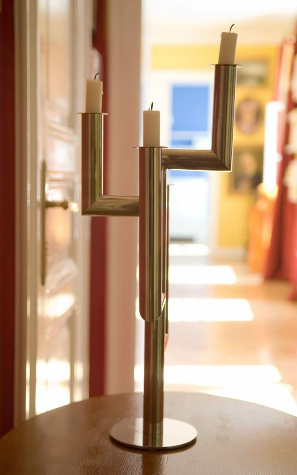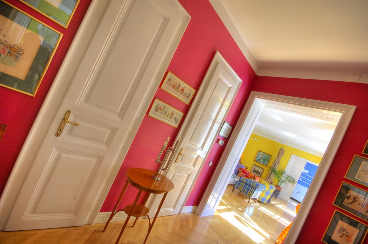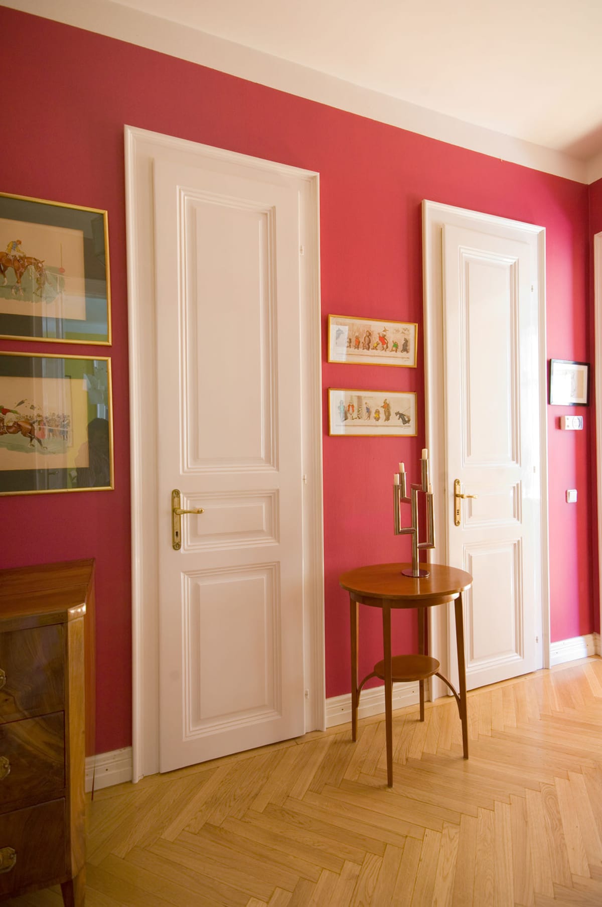 Ein Durchgangsraum mit ca. 10 m² und sechs Türen. Die weißen Lackflächen und der weiße Plafond stehen in einem wunderschönen Kontrast zu den himbeerfarbenen Wänden und lassen dem fensterlosen Raum strahlen.