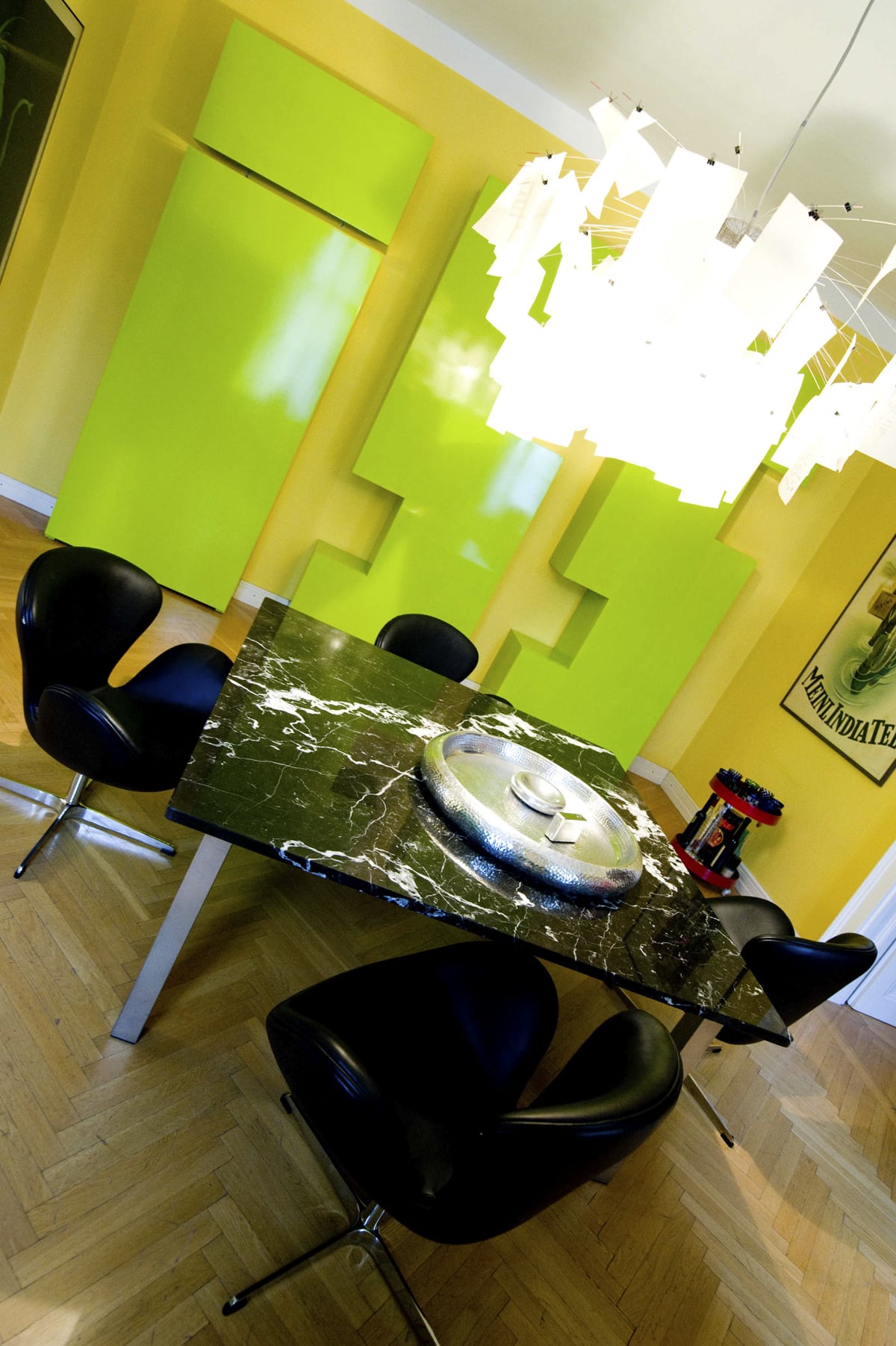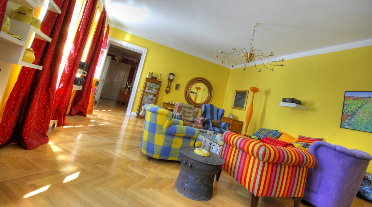 Zwei abgewohnte Wohnungen wurden hier zusammengelegt, Küche, Bad und die WCs neu gemacht, die Türen und Fenster saniert, der Fischgrät-Parkettboden ergänzt bzw. neu verlegt, geschliffen und versiegelt. Von allen Wänden wurden die Tapeten entfernt und in einem auf jedes Zimmer abgestimmten Farbkonzept neu gestrichen.