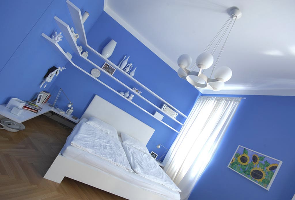 Das Schlafzimmer in Blau/Weiß und mit viel Kitsch. Und Josef Frank Stoffen. Die Farbe Blau wirkt beruhigend und entspannend. Sie eignet sich optimal, um Stress und Hektik abzubauen, um inneren und äußeren Frieden und einen erholsamen Schlaf zu finden.