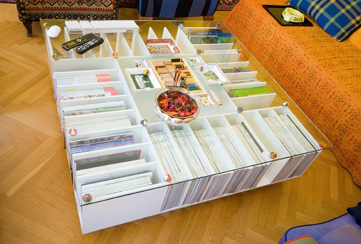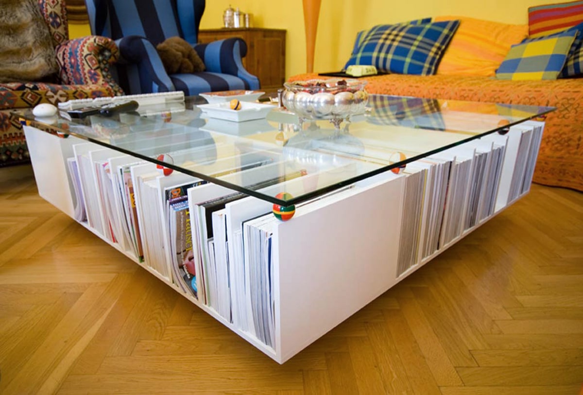 Auch das Wohnzimmer musste für die Sammelwut des Besitzers herhalten. Den Zeitungsregaltisch können Sie in fast jedem gewünschten Format bei uns bestellen.