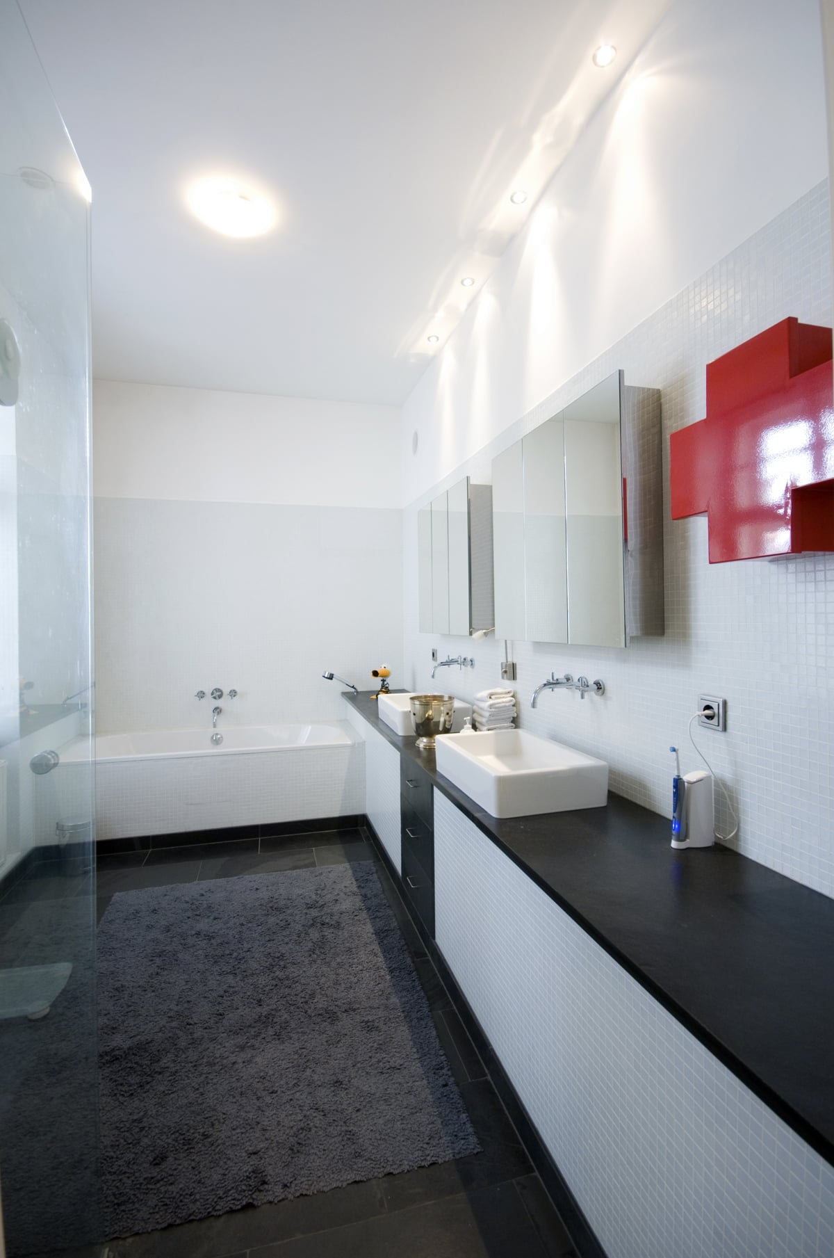 Das Bad (11m²). In der klassischen Farbkombination Schwarz/Weiß – Glasmosaik mit Schiefer – und roten Farbtupfern.