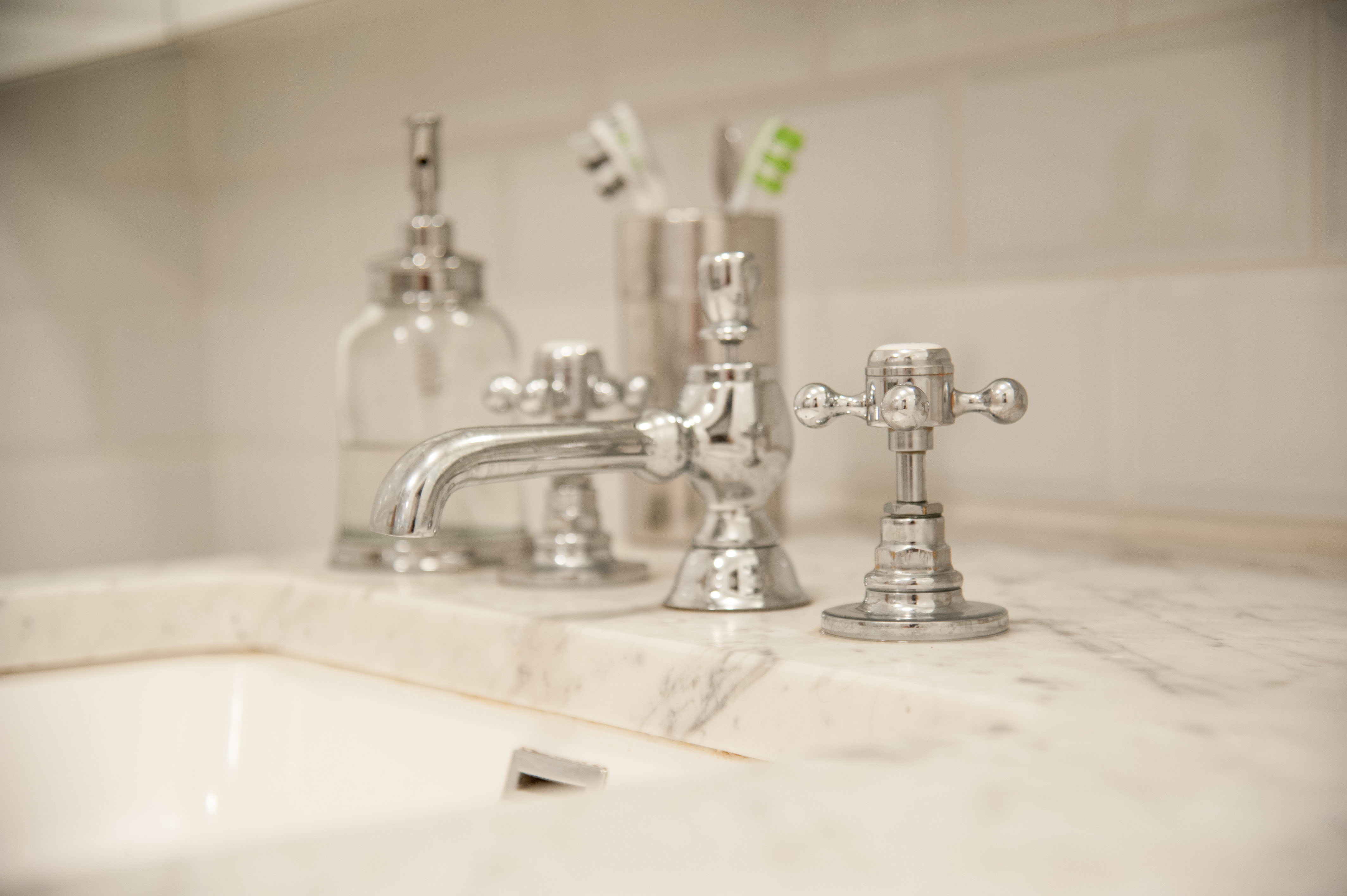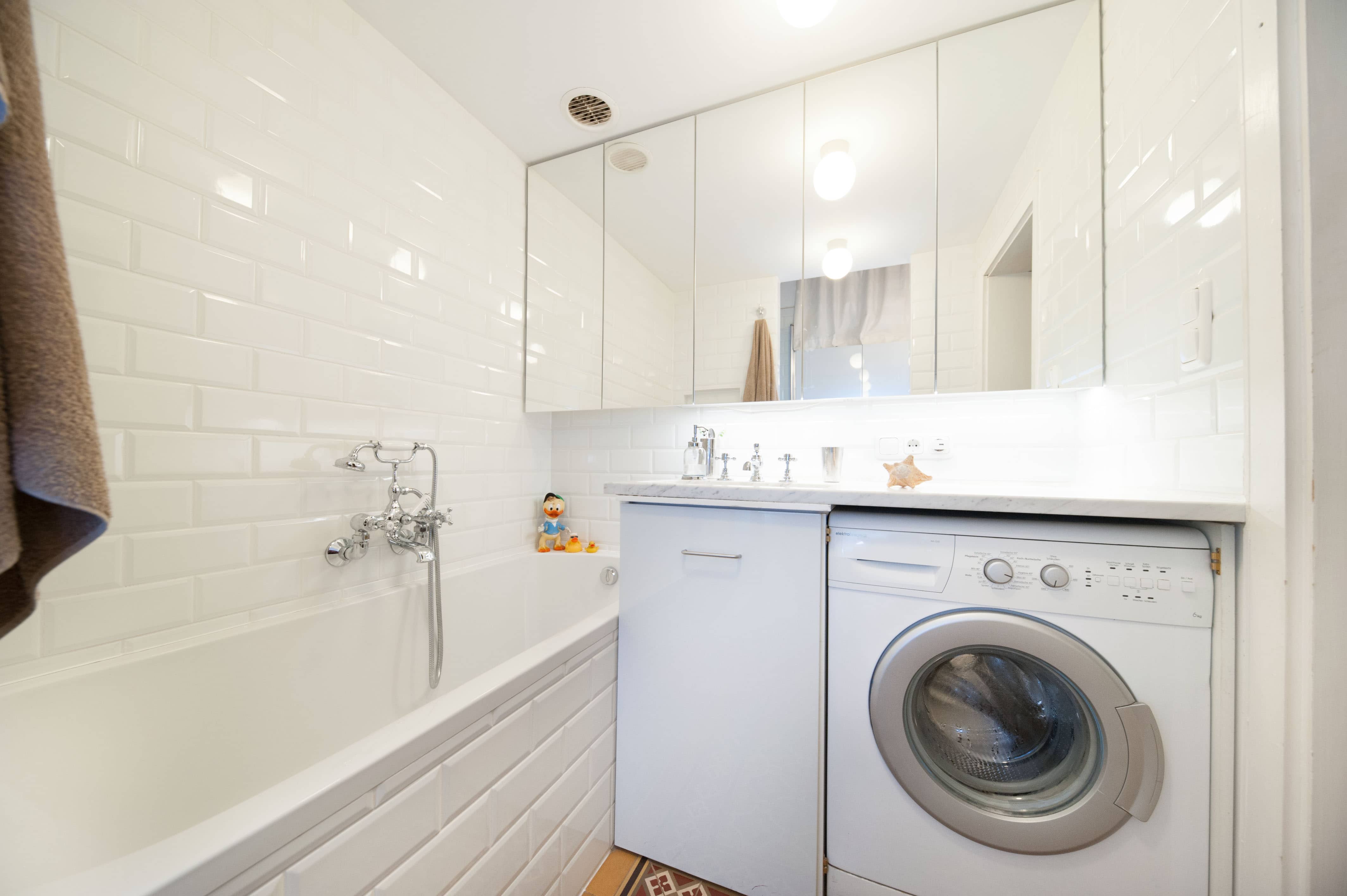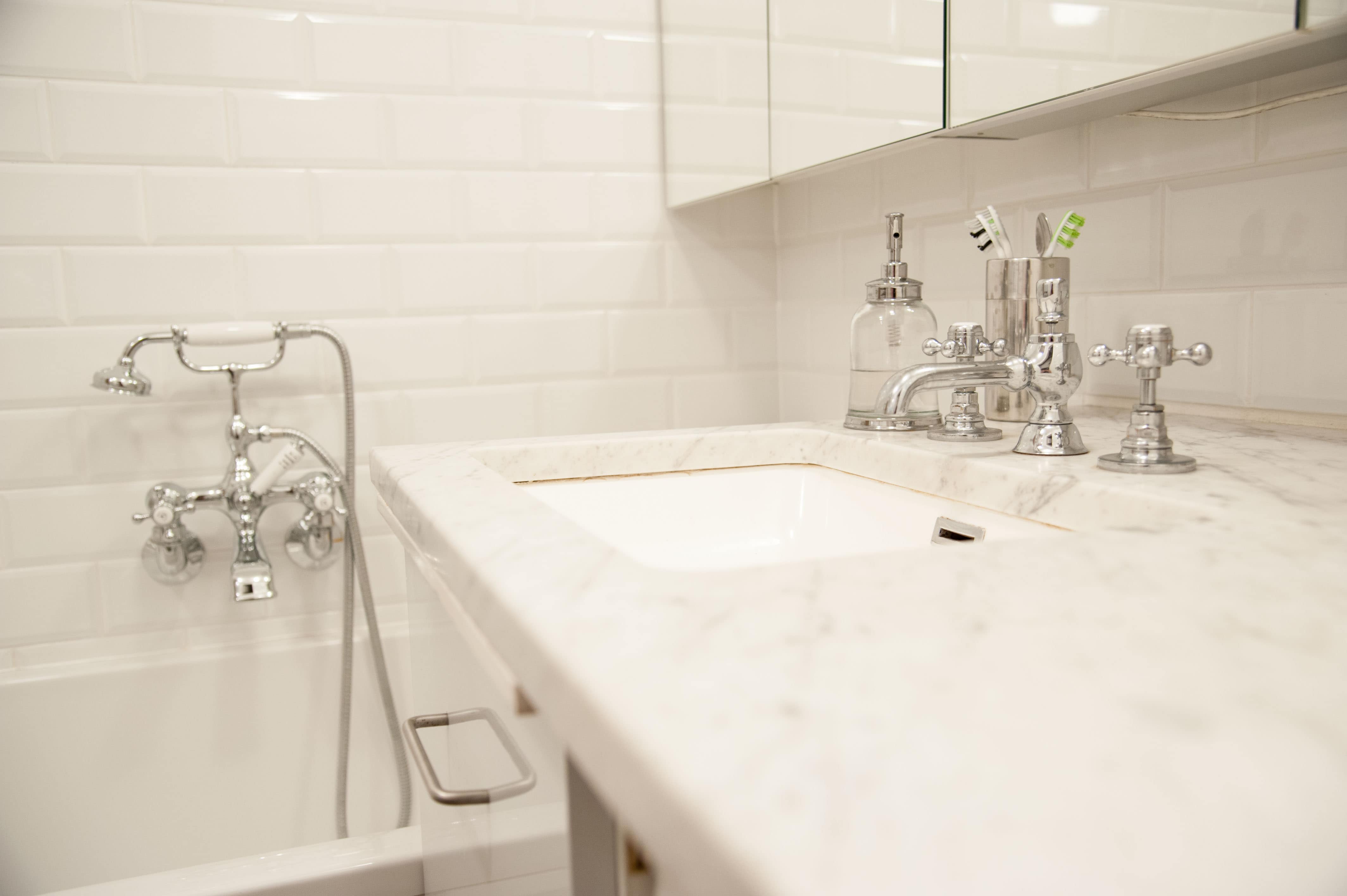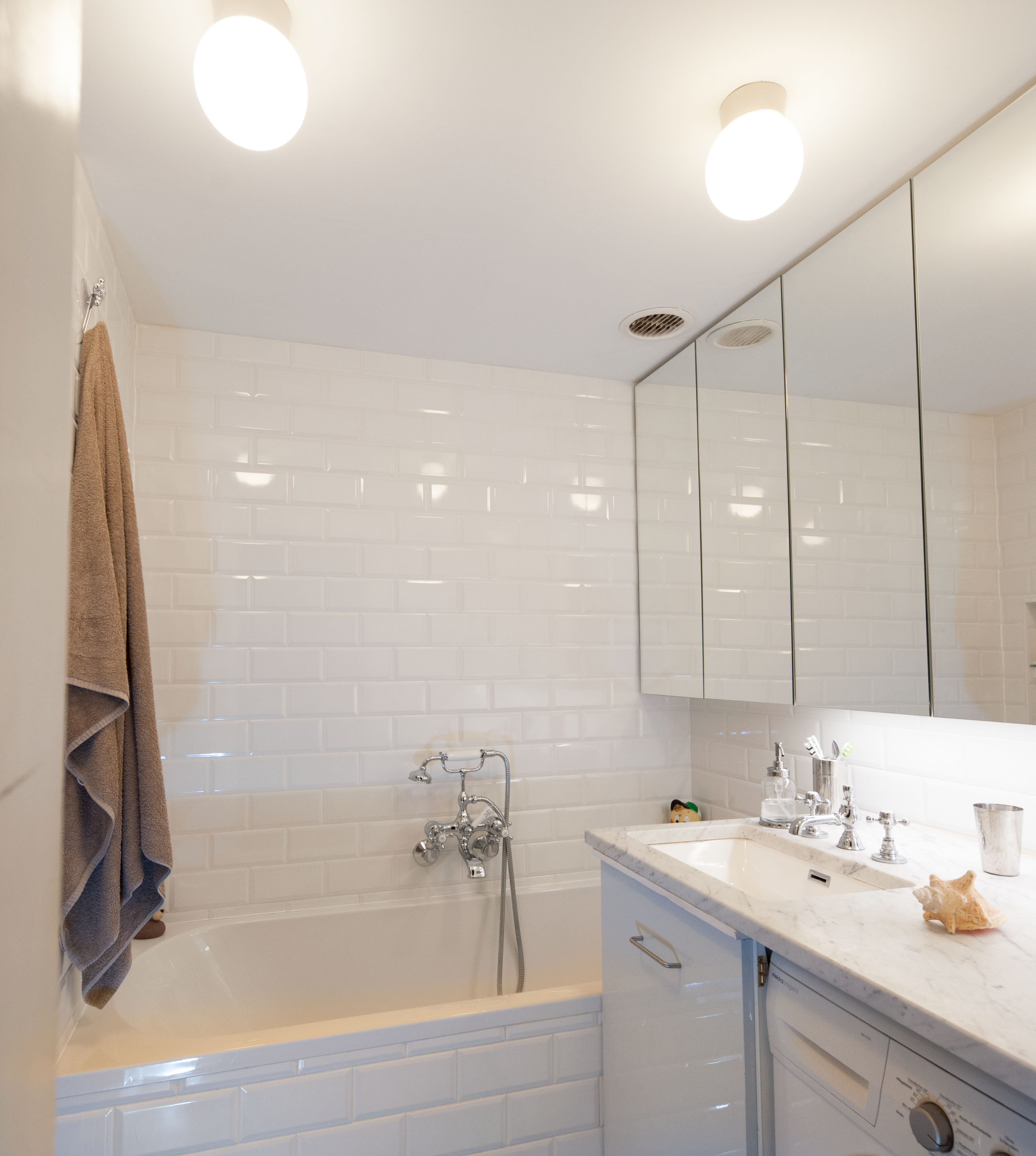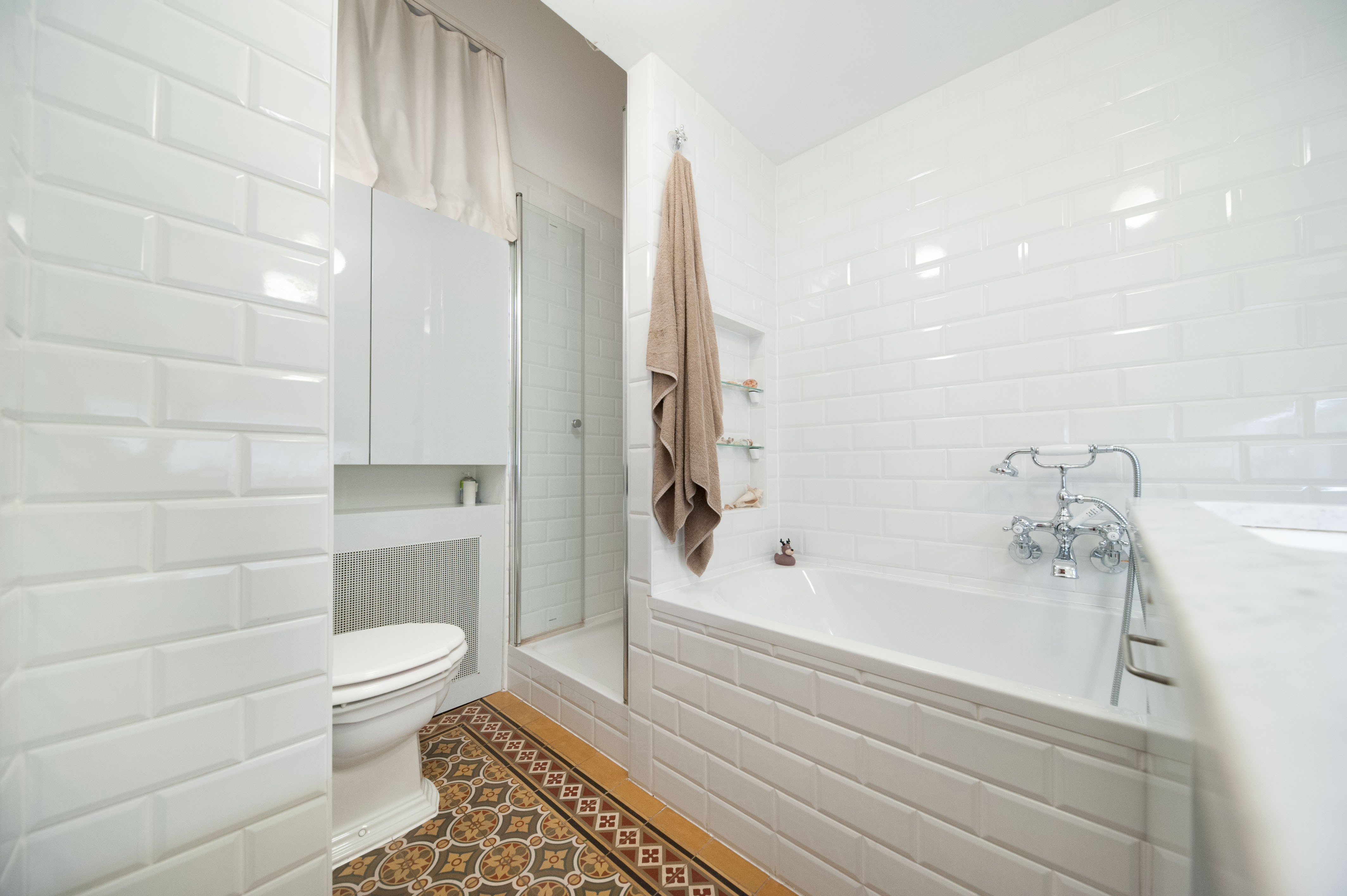 Die Wände mit den Metrofließen in gebrochenem Weiß, die klassischen Zementfließen mit Fries am Boden und die große Spiegelfläche lassen das 5 m2 kleine Bad viel größer wirken. Die britischen Armaturen Klassiker bringen einen Hauch von Luxus in das Essemble.
