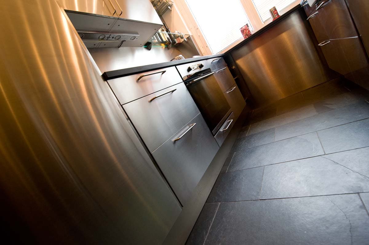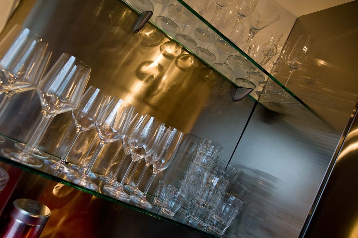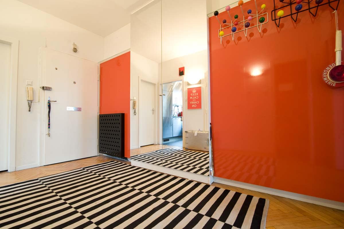 Die stark zerklüftete Wand im Vorzimmer bekam eine durchgängige Front, hinter der sich die unterschiedlich tiefen Bereiche verstecken. Im ersten Bereich wurden sowohl der Heizkörper als auch der Zählerkasten abgedeckt. Hinter dem raumhohen Spiegel befindet sich ein 70 cm tiefer Garderobekasten. Die Kleiderablage deckt verschiedene Leitungen ab.
