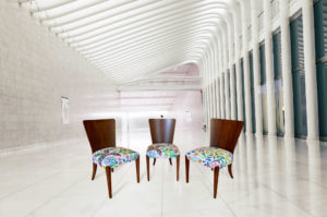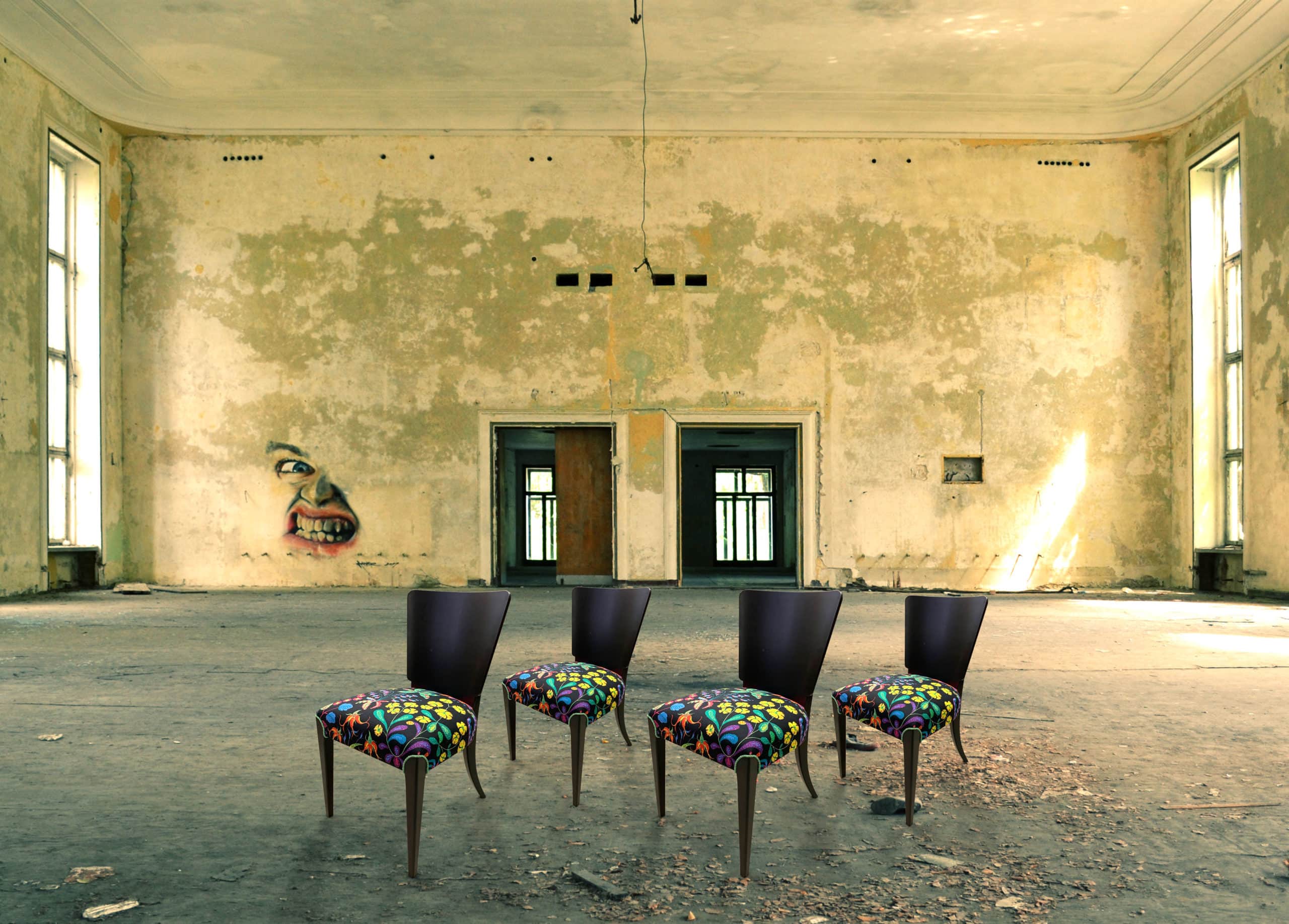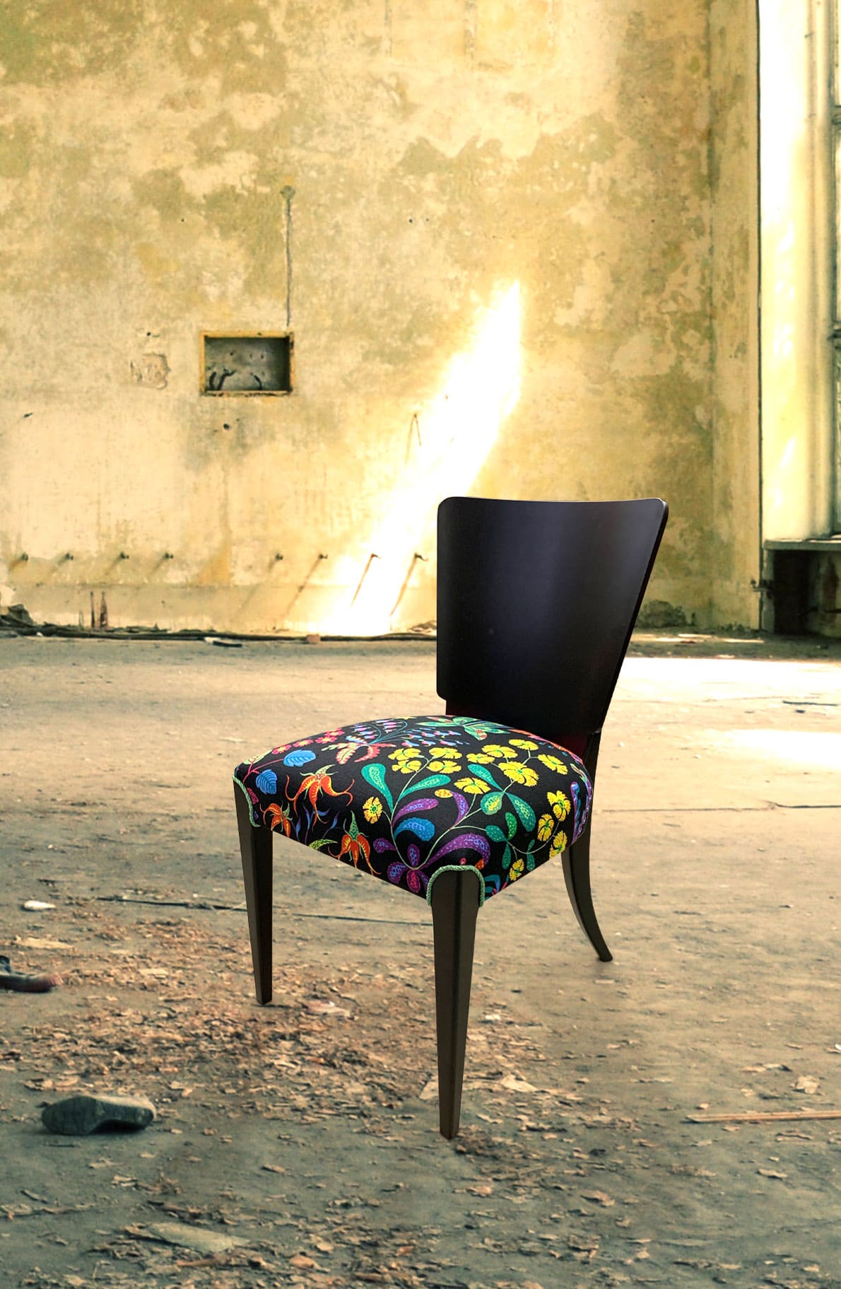 Jindrich Halabala möge es uns verzeihen, dass wir vier Stück seiner Sessel H 214 schwarz matt lackiert haben, aber diese Kombination mit dem Svenskt Tenn Stoff “Unter dem Äquator Schwarz” entworfen von Josef Frank wollten wir unbedingt ausprobieren.