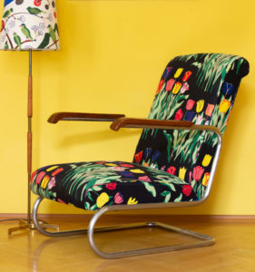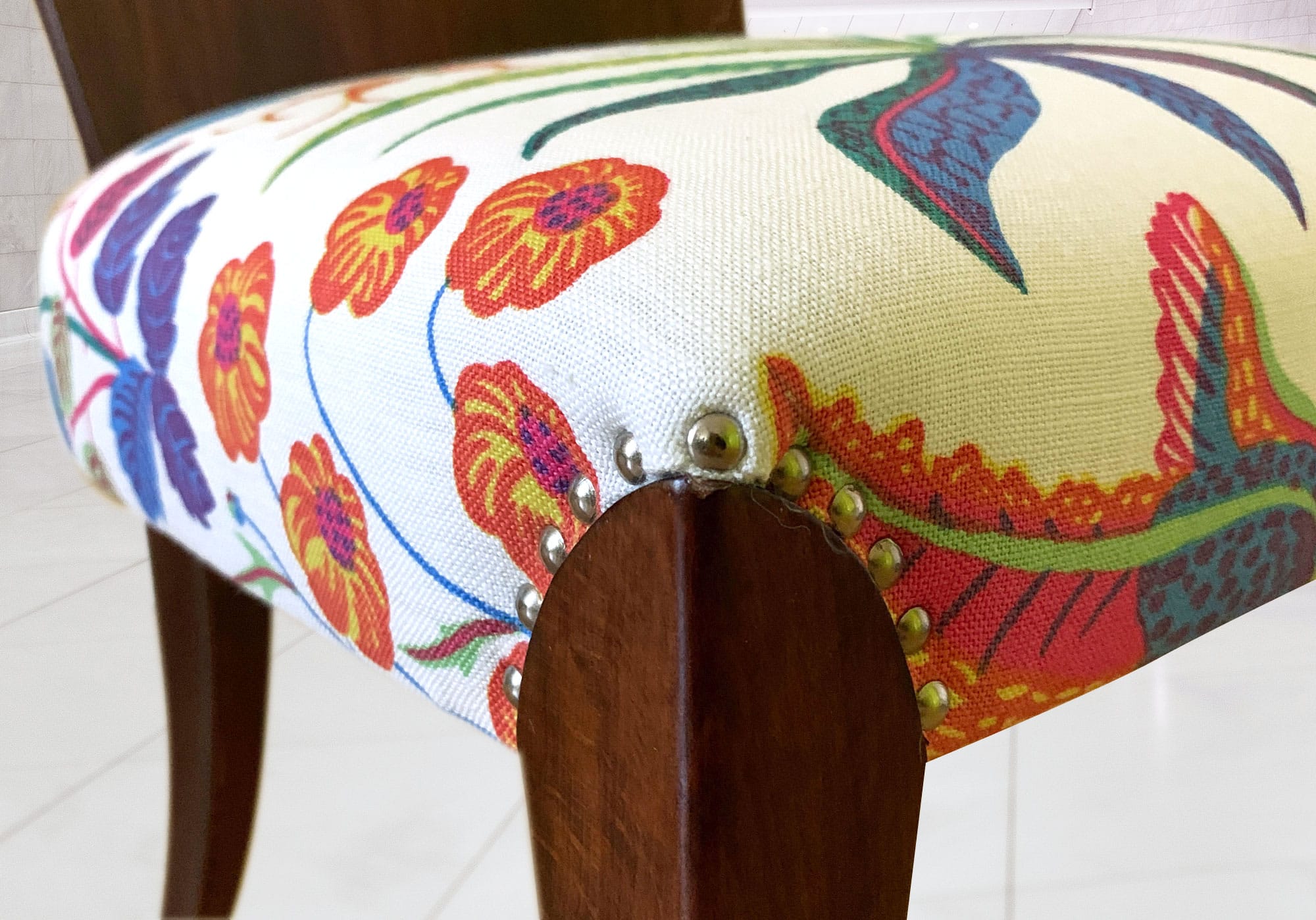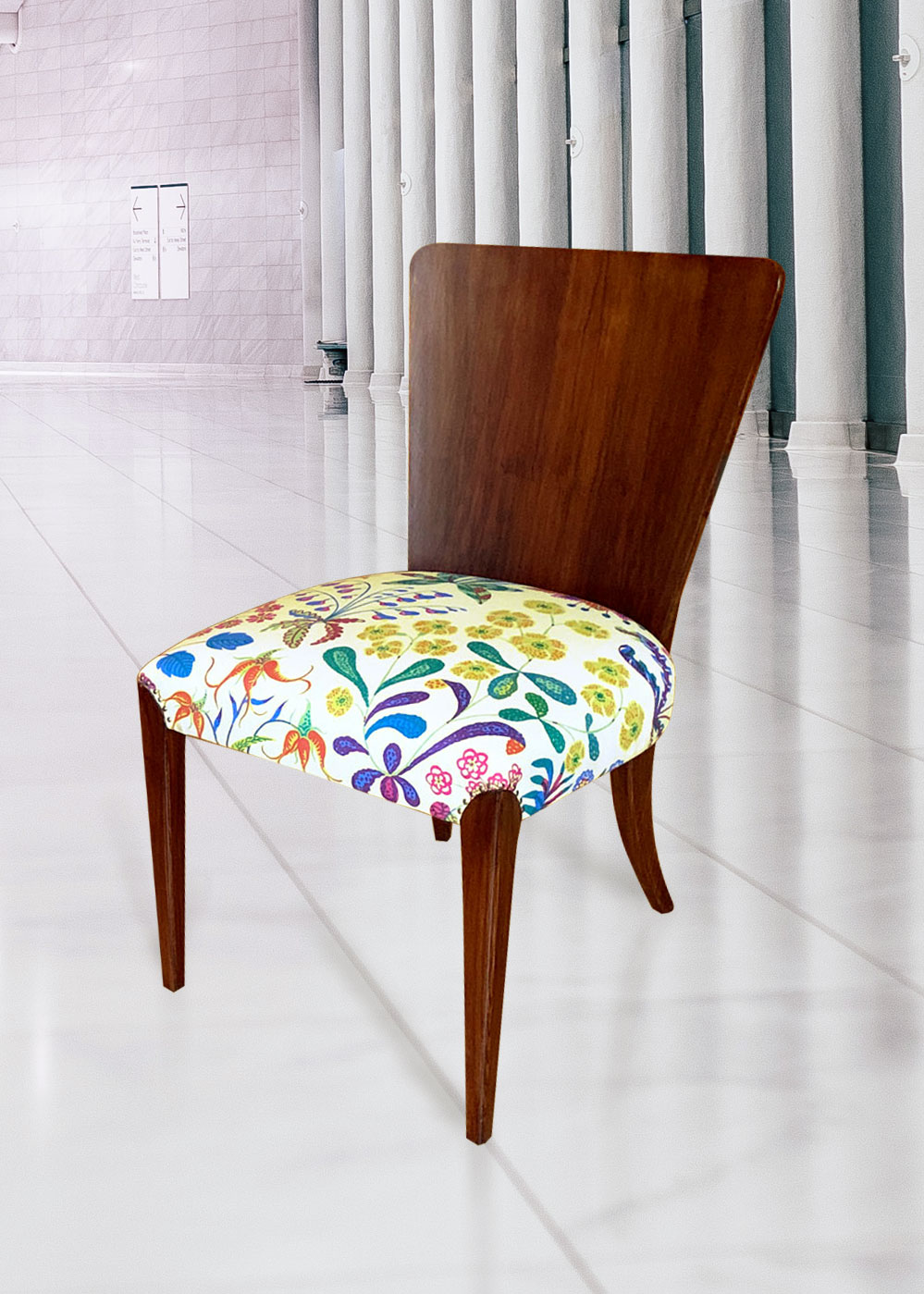 Dieser Art Déco Esszimmersessel von Jindrich Halabala wurde in den 30er Jahren entworfen und in Tschechien für Thonet hergestellt. Die drei Sessel wurden perfekt restauriert und der Svenskt Tenn Stoff “Unter dem Äquator Weiß” entworfen von Josef Frank verleiht ihnen eine besondere Note. Weitere Stücke, vorerst noch unrestauriert und in jedem Svenskt Tenn Stoff entworfen von Josef Frank tapezierbar, sind verfügbar.