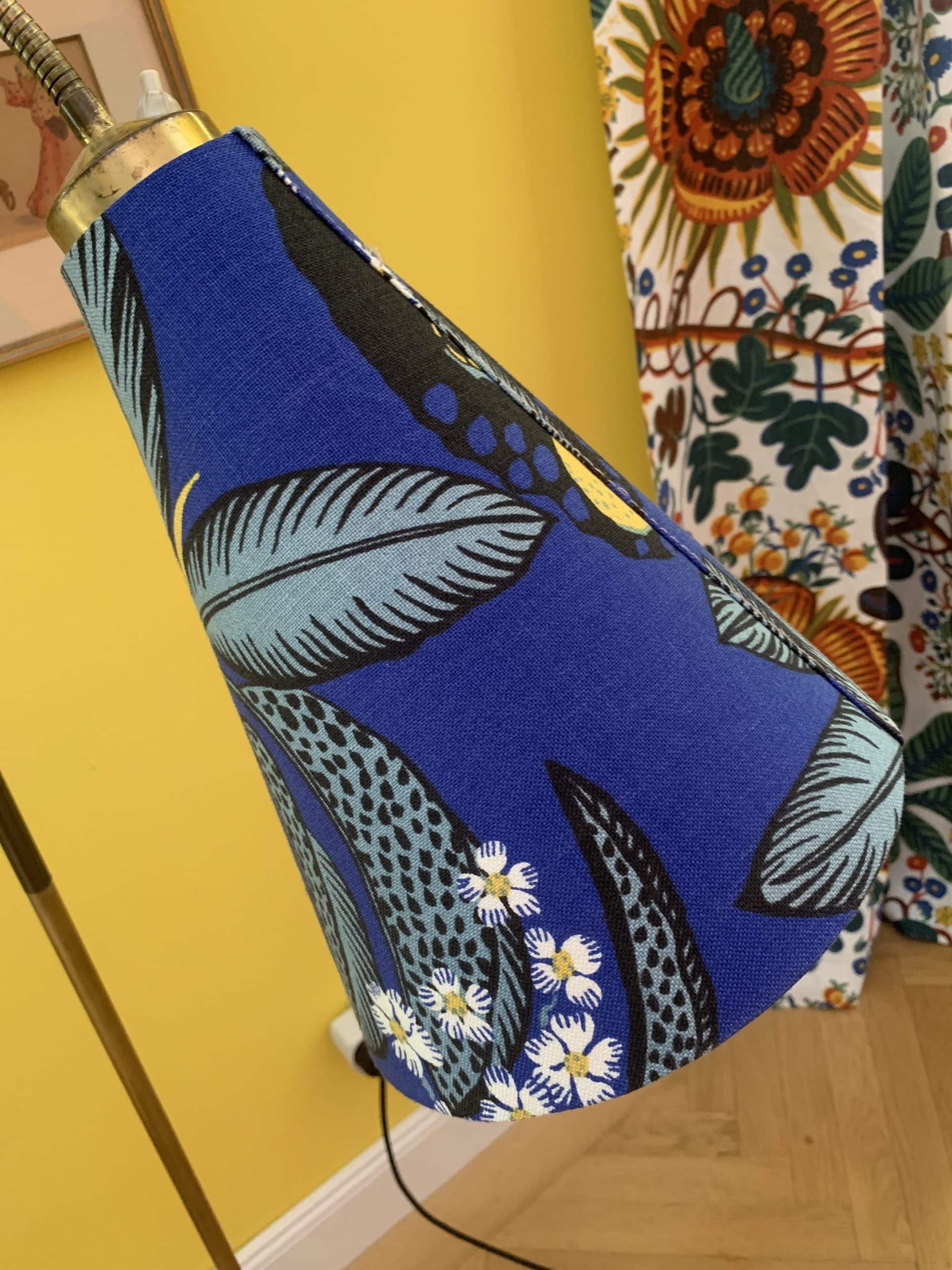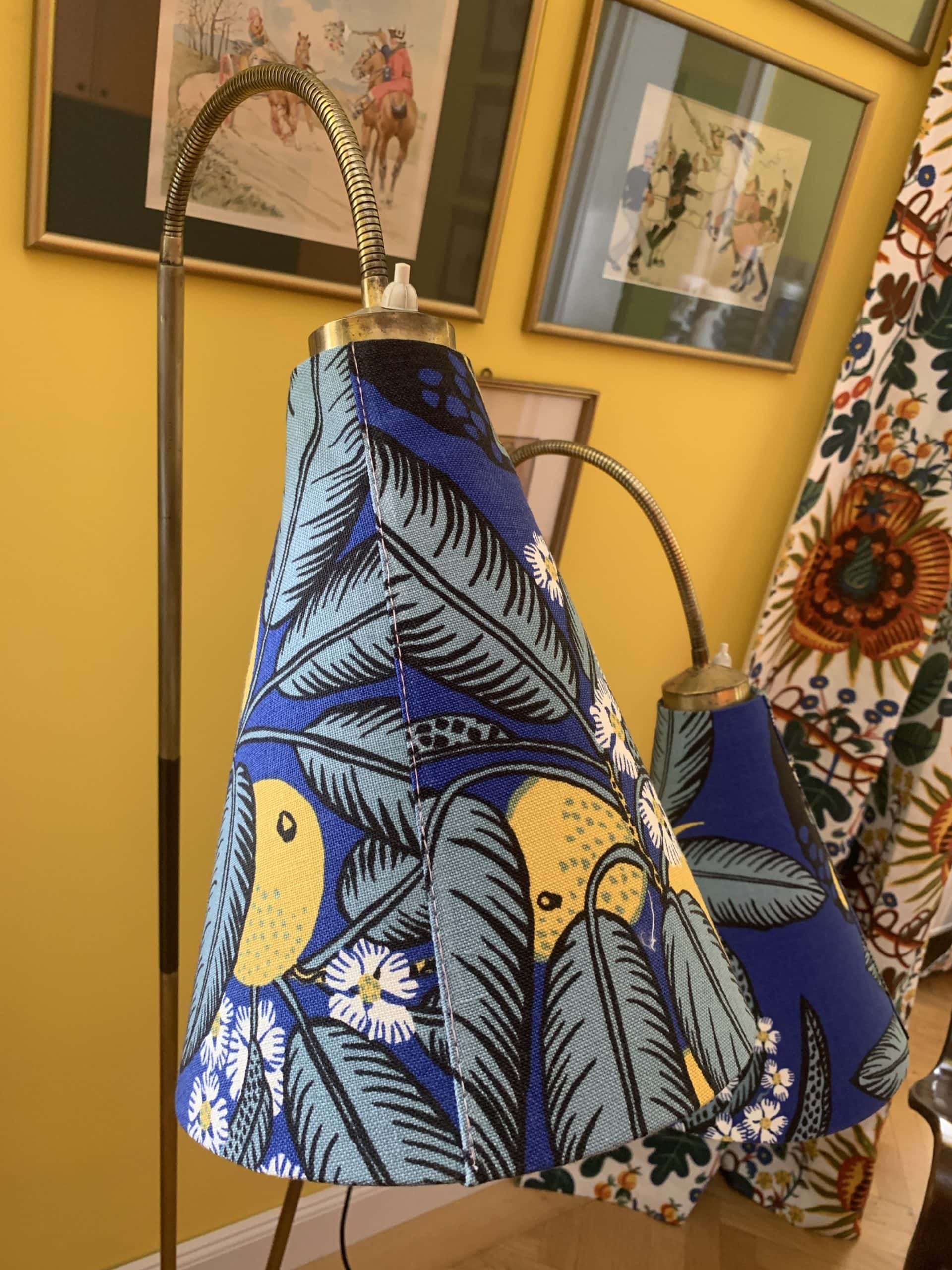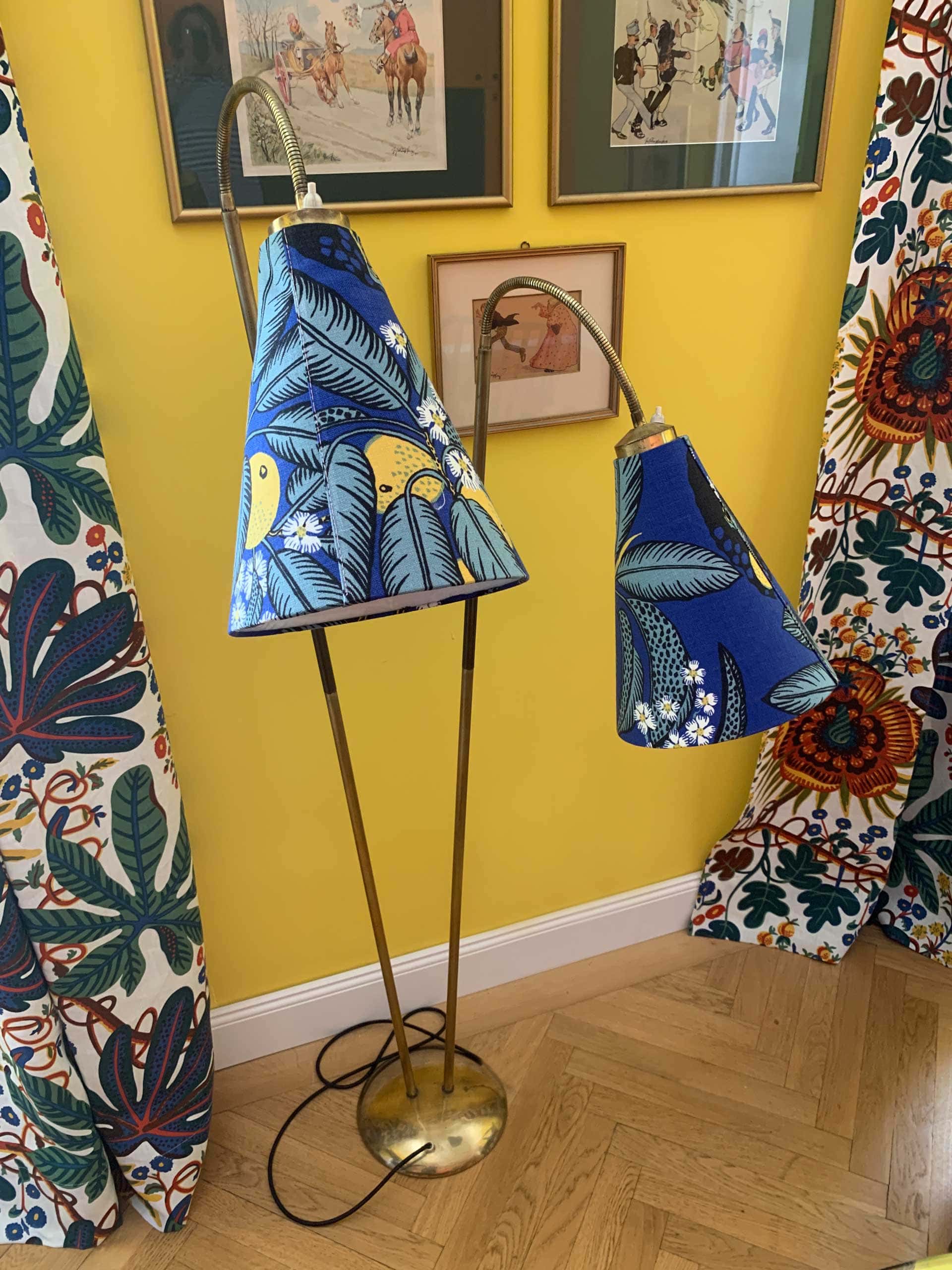 So schön kann Retro sein. 2-armige Messingstehlampe. Die dunkle Teile im Messing sind Kunststoffgriffe, damit man am Messing keine Griffspuren hinterlässt. Die neuen Schirme sind aus dem Svenkst Tenn Stoff „Notturno“ entworfen von Josef Frank.